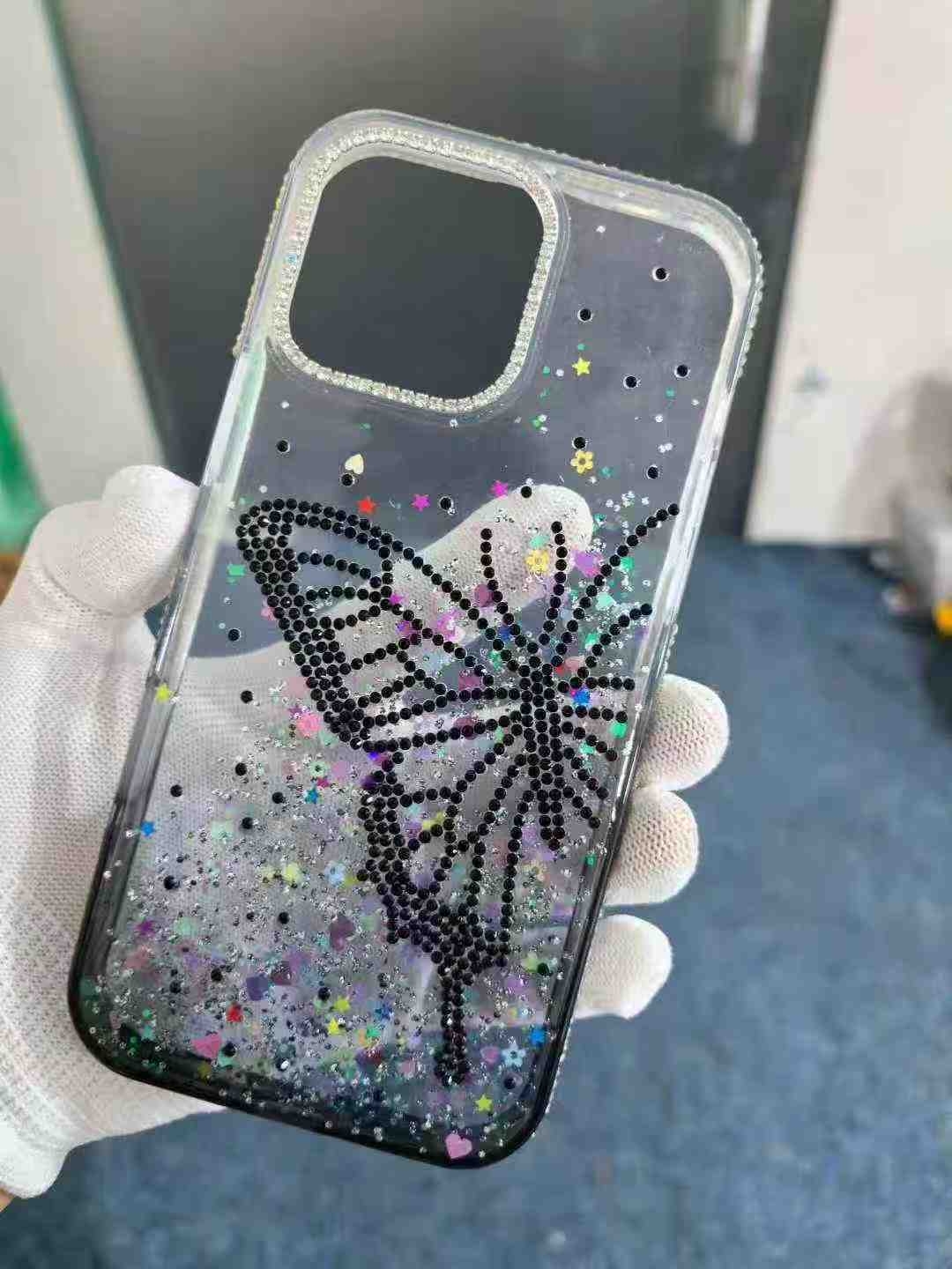 این قاب ژلهای شفاف با طرح پروانه ساخته شده از نگینهای مشکی، ظاهری براق و خاص به گوشی شما میدهد. اکلیلهای رنگی و ستارهای که درون قاب پخش شدهاند، جلوهای درخشان ایجاد کرده و قاب را به گزینهای ایدهآل برای طرفداران طرحهای فانتزی و هنری تبدیل کرده است.